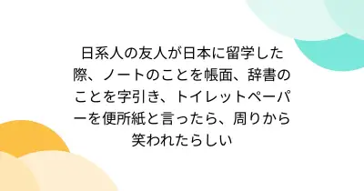 日系人の友人が日本に留学した際、ノートのことを帳面、辞書のことを字引き、トイレットペーパーを便所紙と言ったら、周りから笑われたらしい