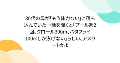 80代の母が「もう体力ない」と落ち込んでいた→話を聞くと「プール週2回、クロール300m、バタフライ100mしか泳げない」らしい、アスリートかよ