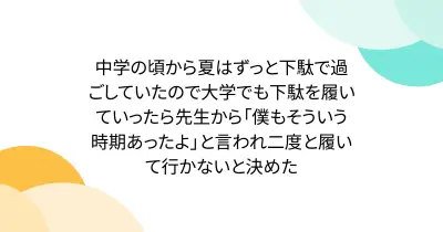 中学の頃から夏はずっと下駄で過ごしていたので大学でも下駄を履いていったら先生から「僕もそういう時期あったよ」と言われ二度と履いて行かないと決めた