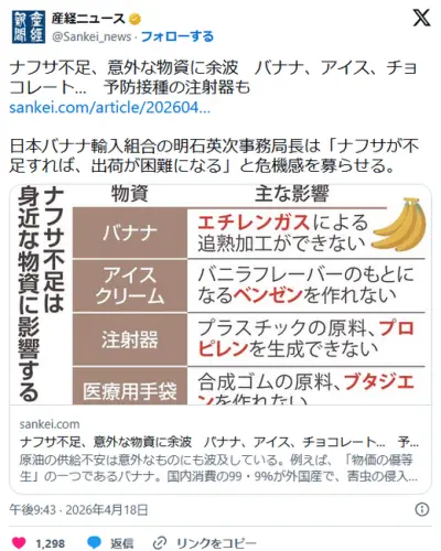 【🍌🍨🍫💉】ナフサ不足、意外な物資に余波 バナナ、アイス、チョコレート… 予防接種の注射器も