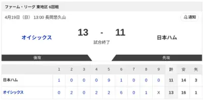 【試合結果】オイシックスvs日本ハム2軍 13-11|東地区6回戦|個人成績|4/19