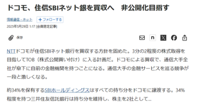 NTTドコモ、住信SBIネット銀行の買収でドコモ銀行爆誕か