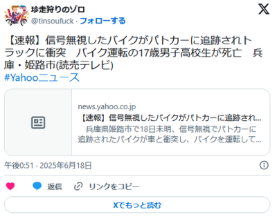【兵庫】パトカーから逃走のバイクがトラックに衝突 17歳男子高校生が死亡 信号無視、無免許運転だったという