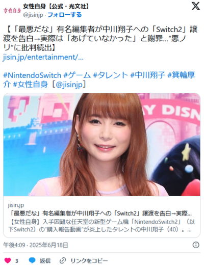箕輪厚介氏、中川翔子への「Switch2」譲渡 実際は「あげていなかった」と謝罪 「そもそもSwitch2も当選していません」