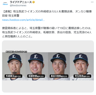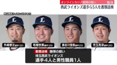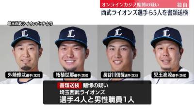 西武・外崎、柘植、長谷川、児玉がオンラインカジノ賭博容疑で書類送検