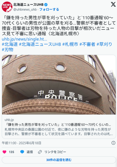 【北海道】「鎌を持った男性が公園で草を刈っていた」と110番通報