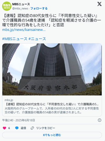 【大阪】「認知症を軽減させるための介護の一貫だ」 グループホームで80代女性2人に不同意性交 職員の54歳男逮捕