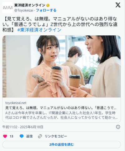 「見て覚えろは無理」マニュアルがないのはあり得ない…「普通こうでしょ」Z世代から上の世代への強烈な違和感