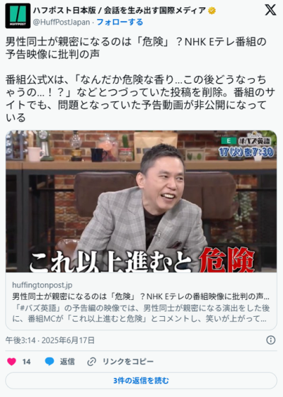 NHKEテレ番組公式X、親密な男性同士に「危険な香り」と投稿、のちに削除 「差別を助長する意図は全くない」と説明