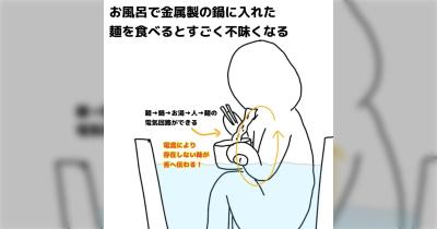『お風呂で金属製の鍋に入れた麺を食べるとすごく不味くなる』→どうしても体験したくてやってみたら本当に不味かった、ちゃんと「電気の味」がする