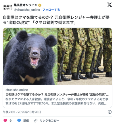 元自衛隊弁護士「熊を倒すのに銃はいりません。剣があれば十分。よって発砲許可など取らなくて良い」