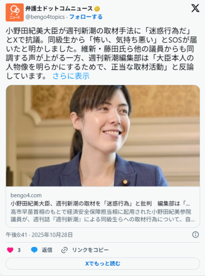 週刊新潮、小野田氏の地元や同級生らへの取材で気持ち悪がられるのを「正当な取材」と反論