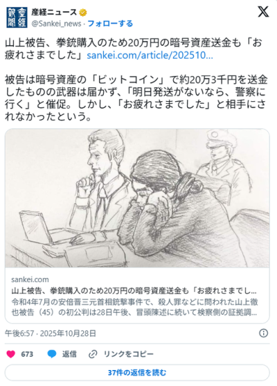 山上 銃購入目的で暗号資産20万円支払うも、購入できず「警察に通報する!」