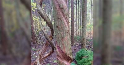 フジに絞められた杉の木を見て「十二様」を連想した話、東北などの地域では信仰に則った「山に入ってはいけない日」がある「荒れた林はクマが出るとも言う」