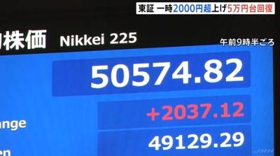 【速報】中国による経済制裁、日本の市場は相手にせず「日経平均、上げ幅一時2000円超で5万円台回復」