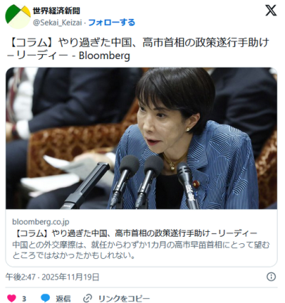 【Bloomberg】やり過ぎた中国、高市首相の政策遂行手助け…「敵意は圧倒的に一方的、高市氏が穏健で現実的に見える」