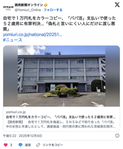 自宅で1万円札をカラーコピー、「パパ活」支払いで使った52歳男に有罪判決…「偽札と言いにくい人にだけに渡し悪質」