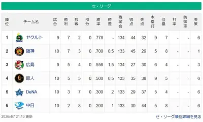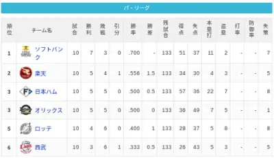 【4/7】パ・リーグ順位表|今季初の完封負け…日ハムの現在順位がこちら