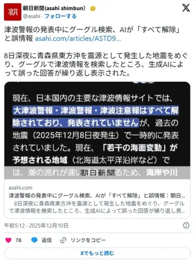 津波警報の発表中にグーグル検索、AIが「すべて解除」と誤情報