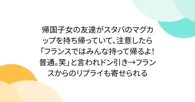 帰国子女の友達がスタバのマグカップを持ち帰っていて、注意したら「フランスではみんな持って帰るよ!普通。笑」と言われドン引き→フランスからのリプライが寄せられる