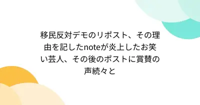 移民反対デモのリポスト、その理由を記したnoteが炎上したお笑い芸人、その後のポストに賞賛の声続々と