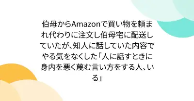 伯母からAmazonで買い物を頼まれ代わりに注文し伯母宅に配送していたが、知人に話していた内容でやる気をなくした「人に話すときに身内を悪く蔑む言い方をする人、いる」