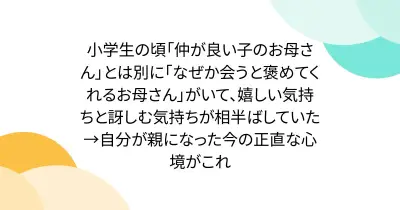小学生の頃「仲が良い子のお母さん」とは別に「なぜか会うと褒めてくれるお母さん」がいて、嬉しい気持ちと訝しむ気持ちが相半ばしていた→自分が親になった今の正直な心境がこれ