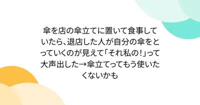 傘を店の傘立てに置いて食事していたら、退店した人が自分の傘をとっていくのが見えて「それ私の!」って大声出した→傘立てってもう使いたくないかも