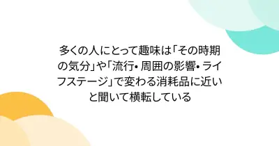 多くの人にとって趣味は「その時期の気分」や「流行• 周囲の影響• ライフステージ」で変わる消耗品に近いと聞いて横転している