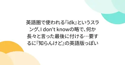 英語圏で使われる『idk』というスラング、I don't knowの略で、何か長々と言った最後に付ける…要するに『知らんけど』の英語版っぽい