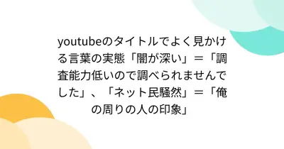 youtubeのタイトルでよく見かける言葉の実態「闇が深い」=「調査能力低いので調べられませんでした」、「ネット民騒然」=「俺の周りの人の印象」