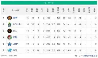 【セ順位スレ】阪神-ヤクルト===/巨人/=広島-DeNA==-中日【4/12】