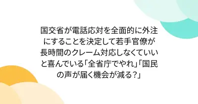 国交省が電話応対を全面的に外注にすることを決定して若手官僚が長時間のクレーム対応しなくていいと喜んでいる「全省庁でやれ」「国民の声が届く機会が減る?」