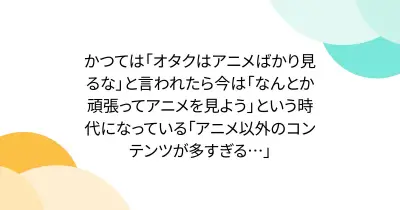 かつては「オタクはアニメばかり見るな」と言われたら今は「なんとか頑張ってアニメを見よう」という時代になっている「アニメ以外のコンテンツが多すぎる…」