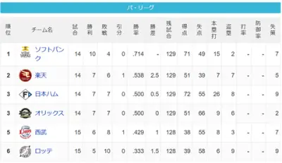 【4/12】パ・リーグ順位表|二連敗…日ハムの現在順位がこちら