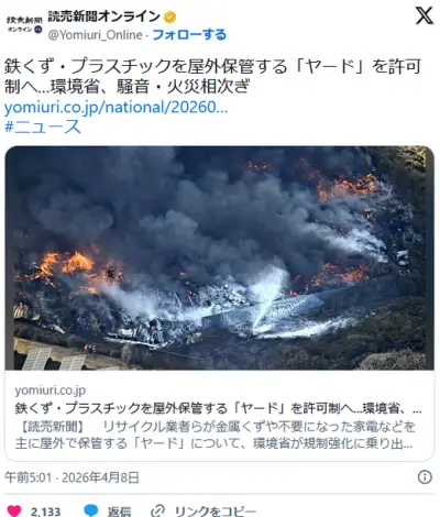 環境省、鉄くず・プラスチックを屋外保管する「ヤード」を許可制へ…騒音・火災相次ぎ「平穏な生活を壊されている」