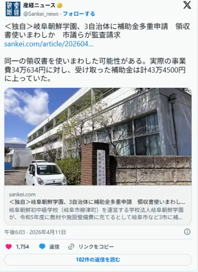 【速報】岐阜朝鮮学園、3自治体に補助金多重申請 領収書使いまわしか 市議らが監査請求
