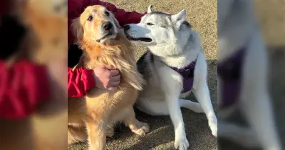初対面での距離感が近すぎて陽キャの大型犬にすらドン引きされてるシベリアンハスキー「ゴールデンでもあかんのか」