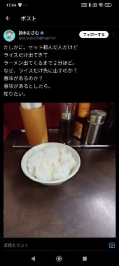 鈴木おさむ「ラーメンライス頼んだらライスだけ出てきた。2分後にラーメンも来たが先にライス出す意味を教えてくれ」