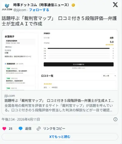 【裁判官マップ】話題呼ぶ 口コミ付き5段階評価―弁護士が生成AIで作成