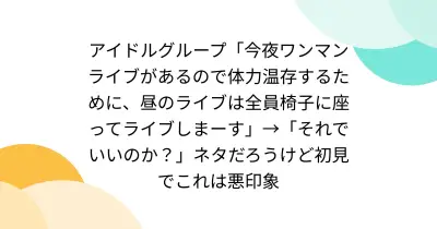アイドルグループ「今夜ワンマンライブがあるので体力温存するために、昼のライブは全員椅子に座ってライブしまーす」→「それでいいのか?」ネタだろうけど初見でこれは悪印象
