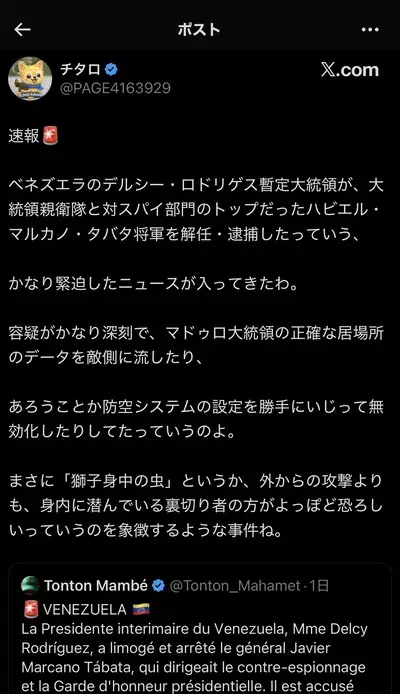 【速報】ベネズエラ対スパイ部門トップを逮捕「米国に大統領の居場所を流し防空システムを無効化した疑い」※なおソースX、恥かいた某国のプロパガンダか?