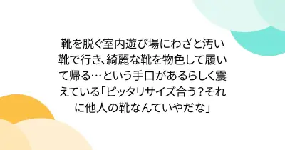 靴を脱ぐ室内遊び場にわざと汚い靴で行き、綺麗な靴を物色して履いて帰る…という手口があるらしく震えている「ピッタリサイズ合う?それに他人の靴なんていやだな」