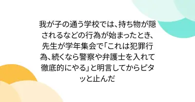 我が子の通う学校では、持ち物が隠されるなどの行為が始まったとき、先生が学年集会で「これは犯罪行為、続くなら警察や弁護士を入れて徹底的にやる」と明言してからピタッと止んだ