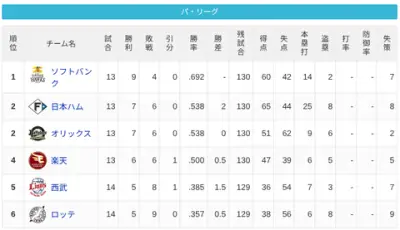 【4/11】パ・リーグ順位表|逆転負け…日ハムの現在順位がこちら