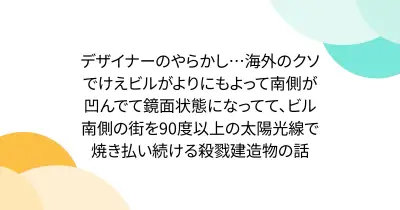 デザイナーのやらかし…海外のクソでけえビルがよりにもよって南側が凹んでて鏡面状態になってて、ビル南側の街を90度以上の太陽光線で焼き払い続ける殺戮建造物の話