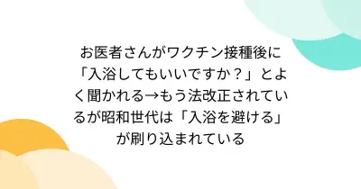 お医者さんがワクチン接種後に「入浴してもいいですか?」とよく聞かれる→もう法改正されているが昭和世代は「入浴を避ける」が刷り込まれている