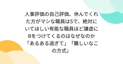人事評価の自己評価、休んでくれた方がマシな職員はSで、絶対にいてほしい有能な職員ほど謙虚にBをつけてくるのはなぜなのか「あるある過ぎて」「難しいなこの方式」