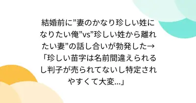 結婚前に”妻のかなり珍しい姓になりたい俺”vs”珍しい姓から離れたい妻”の話し合いが勃発した→「珍しい苗字は名前間違えられるし判子が売られてないし特定されやすくて大変...」