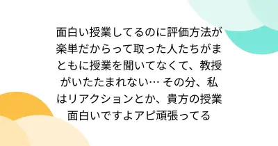 面白い授業してるのに評価方法が楽単だからって取った人たちがまともに授業を聞いてなくて、教授がいたたまれない… その分、私はリアクションとか、貴方の授業面白いですよアピ頑張ってる